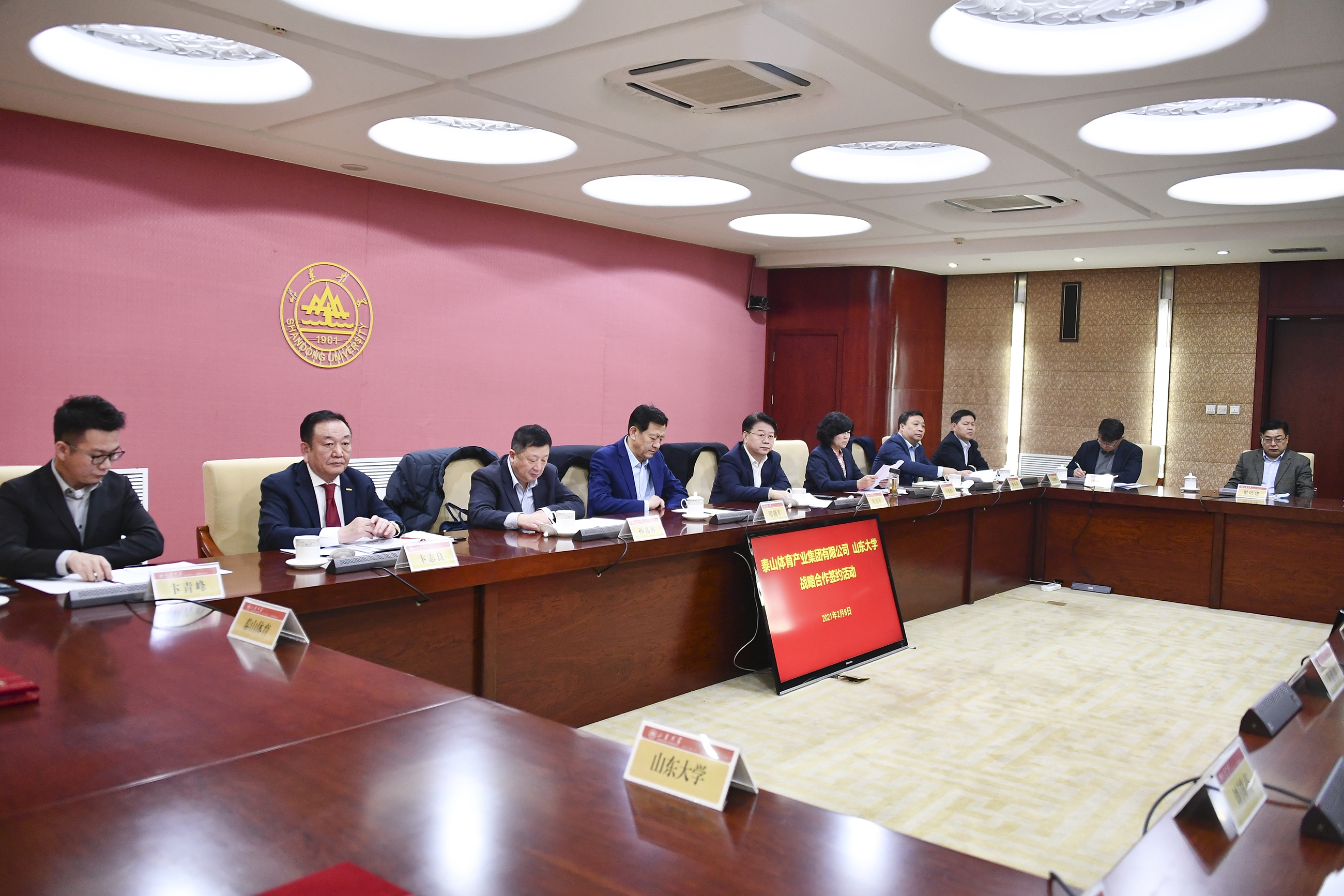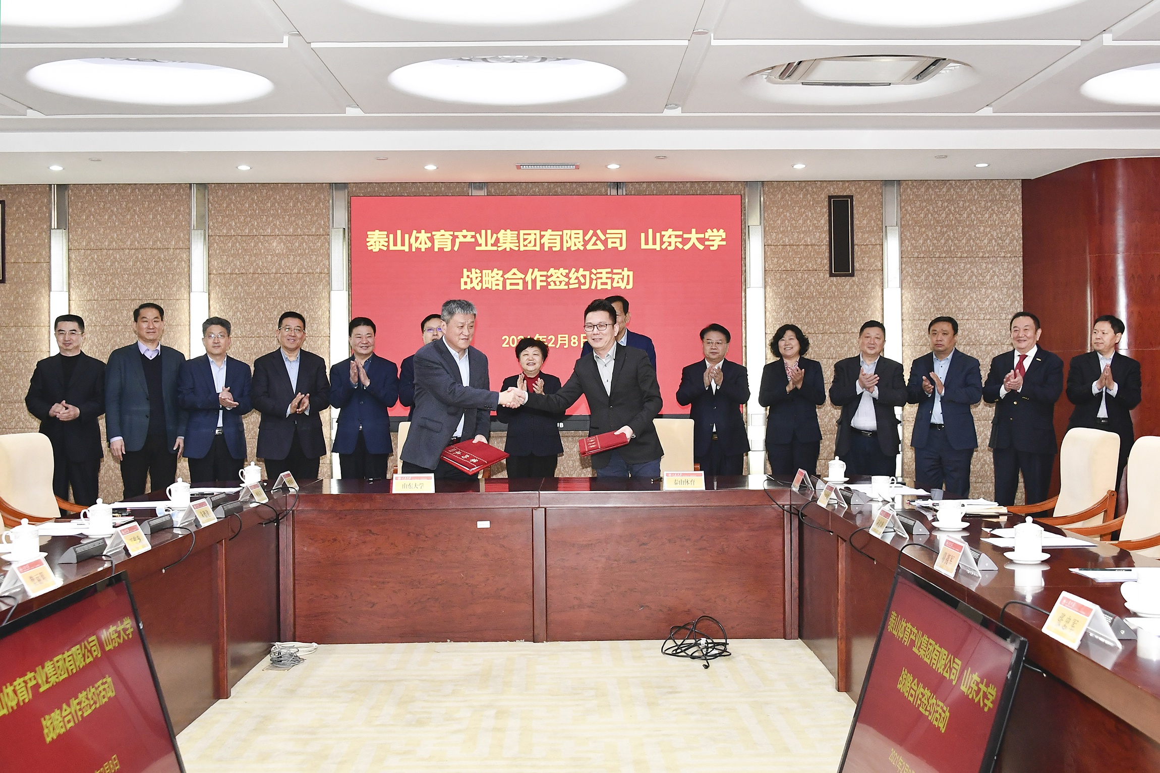 为积极建设“体育强国”、“健康中国”、“健康山东”,努力实现产教融合与产学研深入合作,2021年2月8日,体育产业集团与山东大学战略合作签约仪式在山东大学中心校区隆重举行。山东省体育局党组成员、省体育总会专职常务副主席隋拥军,山东省工信厅二级巡视员张忠军,山东省科技厅总工程师孙高祚,省体育局体育产业发展服务中心主任翟培建,山东省科技厅张大瑞,德州市副市长马俊昀,乐陵市委副书记、市长陈光春,山东大学党委副书记、校长樊丽明,全国政协委员、体育产业集团有限公司董事长卞志良等领导出席仪式。签约仪式由山东大学党委副书记王君松主持。
