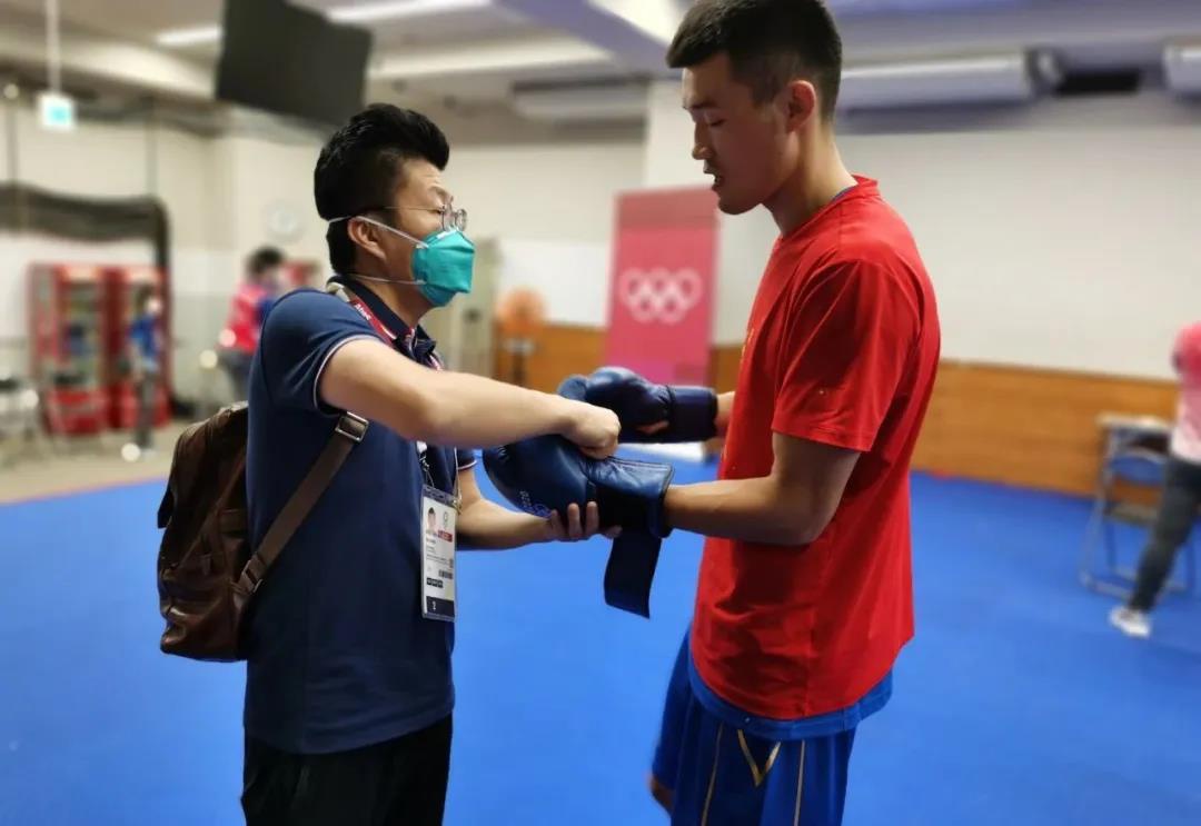 东京奥运会拳击热身馆,体育工作人员帮助运动员穿戴拳击手套